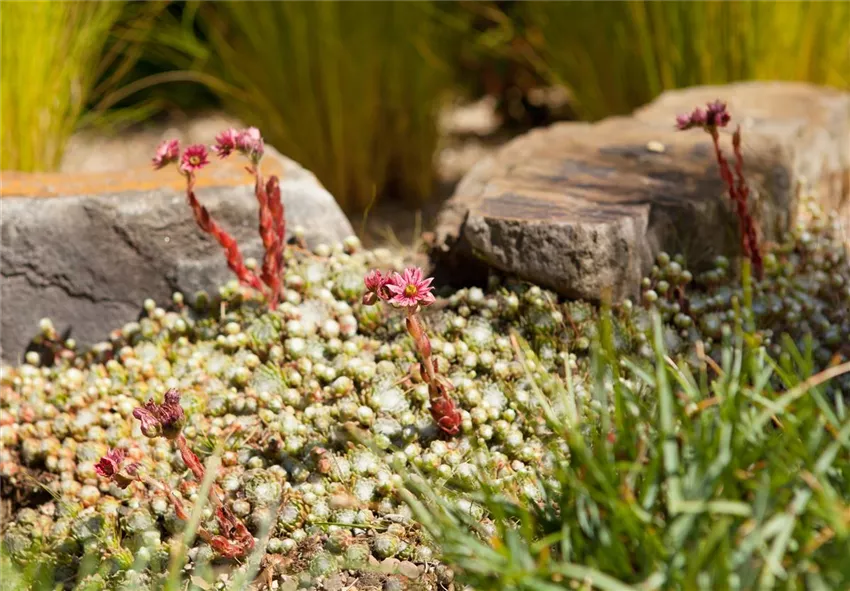 Dabei dürfen sich gern kleinere mit größeren Felsen abwechseln. Damit diese sicher stehen, setzen Sie sie am Besten in ein tiefes Kiesbett. Dieses dient dann auch als Drainage für die Pflanzen.