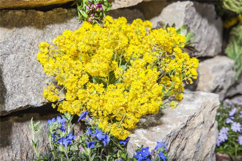 Die Klassiker dafür sind der Enzian, das Edelweiß, die Heidenelke, das Fingerkraut und der Ginster. Aber auch Zwergkoniferen und die dekorative Zirbelkiefer sollten in keinem Steingarten fehlen. Gern gesehene Gäste in einem modernen Steingarten sind aber auch Mittelmeerkräuter wie Rosmarin, Thymian, Salbei und Lorbeer. Und mit bunten Blumen wie Vergissmeinnicht, Lampranthus. Erika, Astern, Nelken, Glockenblumen und Steinkraut können Sie blühende Inseln in Ihren Steingarten setzen.