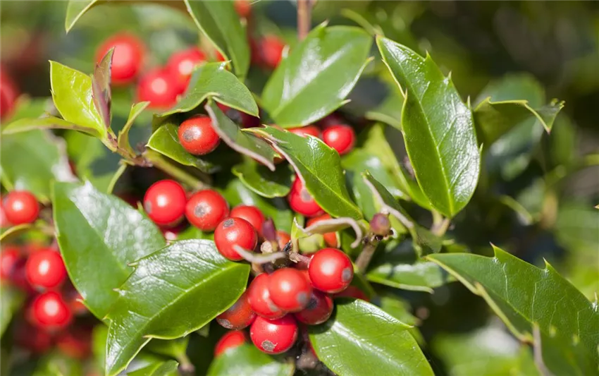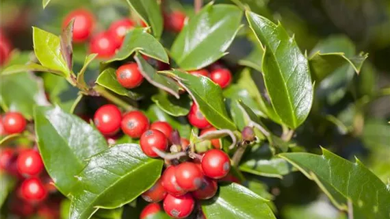 Stechpalme ( Ilex ) ist nicht nur ein schöner Schmuck zur Weihnachtszeit, sondern auch ein sehr schöner Zierstrauch. Allerdings sind Stechpalmen meist zweihäusig, das bedeutet eine Pflanze ist weiblich und eine männlich. Um Beeren zu bekommen brauchen Sie also einen männlichen und einen weiblichen Strauch. Achten Sie beim Kauf auf die Sorten; bei ihnen gibt es rein weibliche und rein männliche Sorten, so sind die Beeren garantiert!